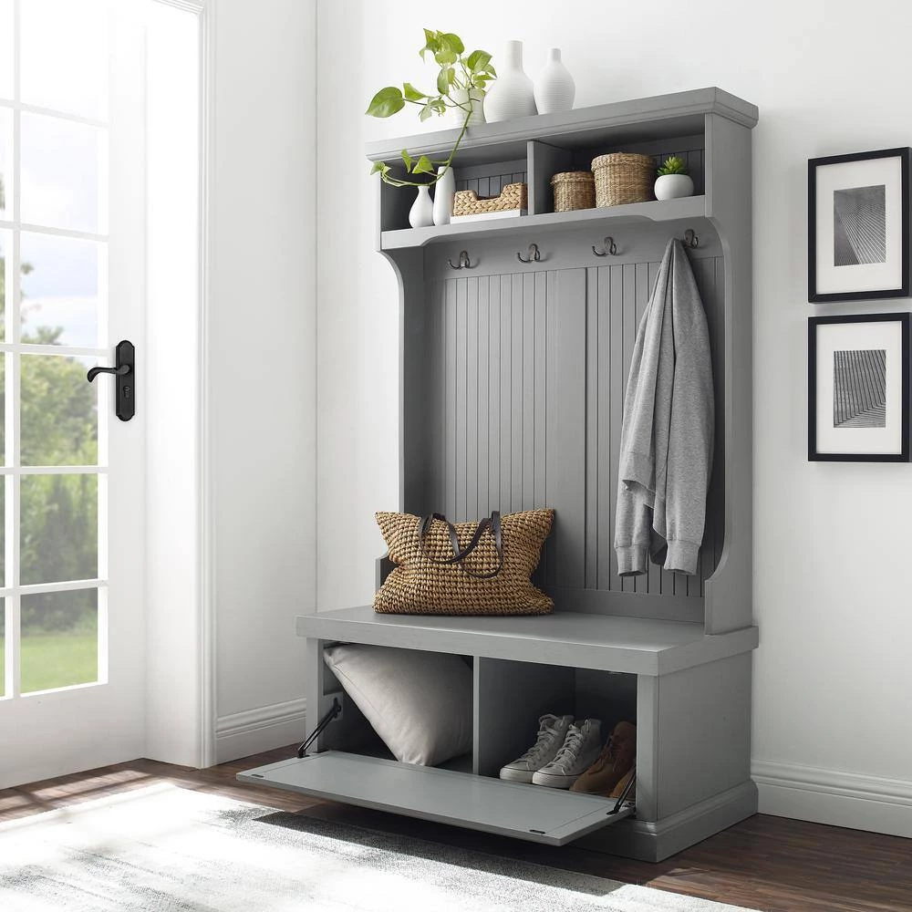 Capture the feeling of an effortless beach home with the Seaside Hall Tree. The full-size bench offers seating or a landing zone for heavy bags and daily essentials. Showcasing classic half-cup pull hardware, the lower storage compartment offers two large cubbies behind a pull-down door. Tuck shoes, storage baskets, or extra blankets in the storage base, while hanging coats, hats, and scarves on the four double prong hooks. 2-smaller overhead cubbies can organize smaller items or showcase decor. Beautifully crafted with beadboard accents and high-end distressing, the Seaside Hall Tree will elevate your home organization.
