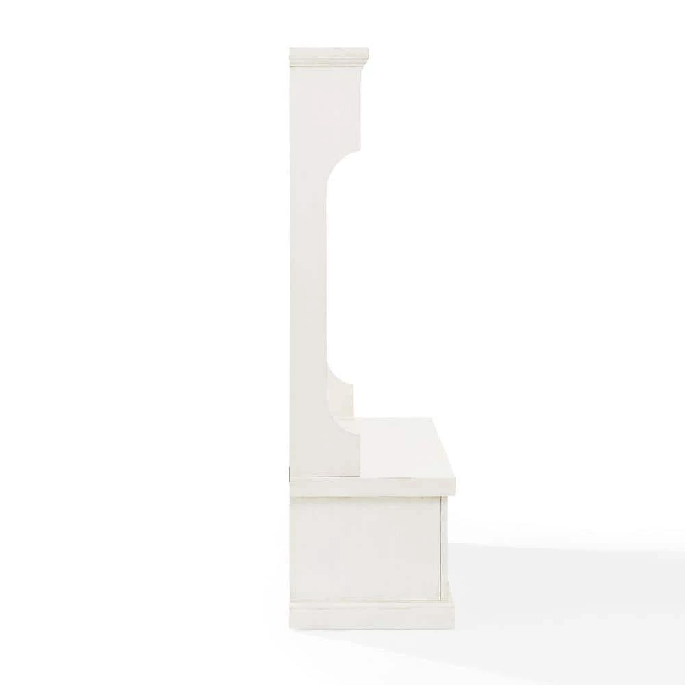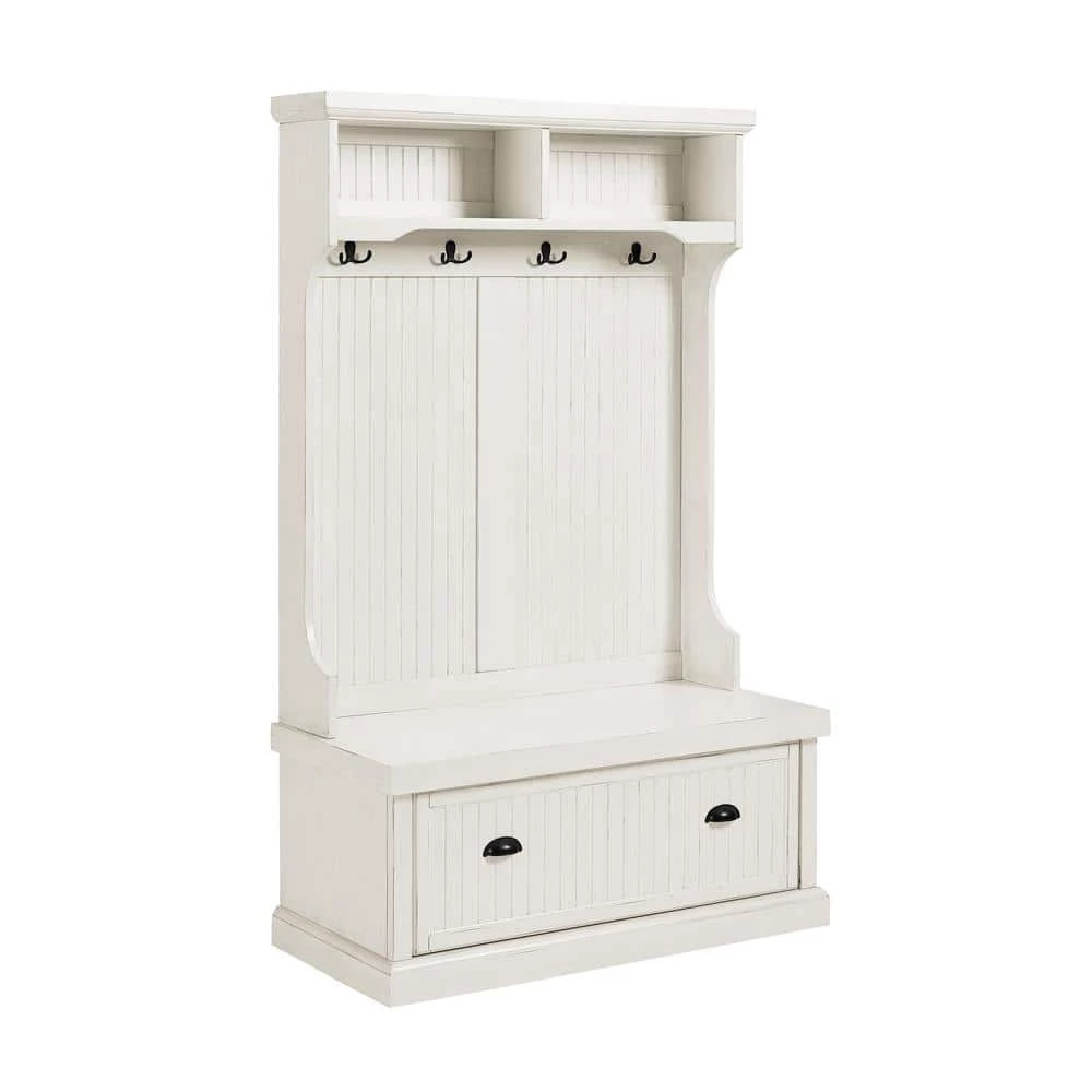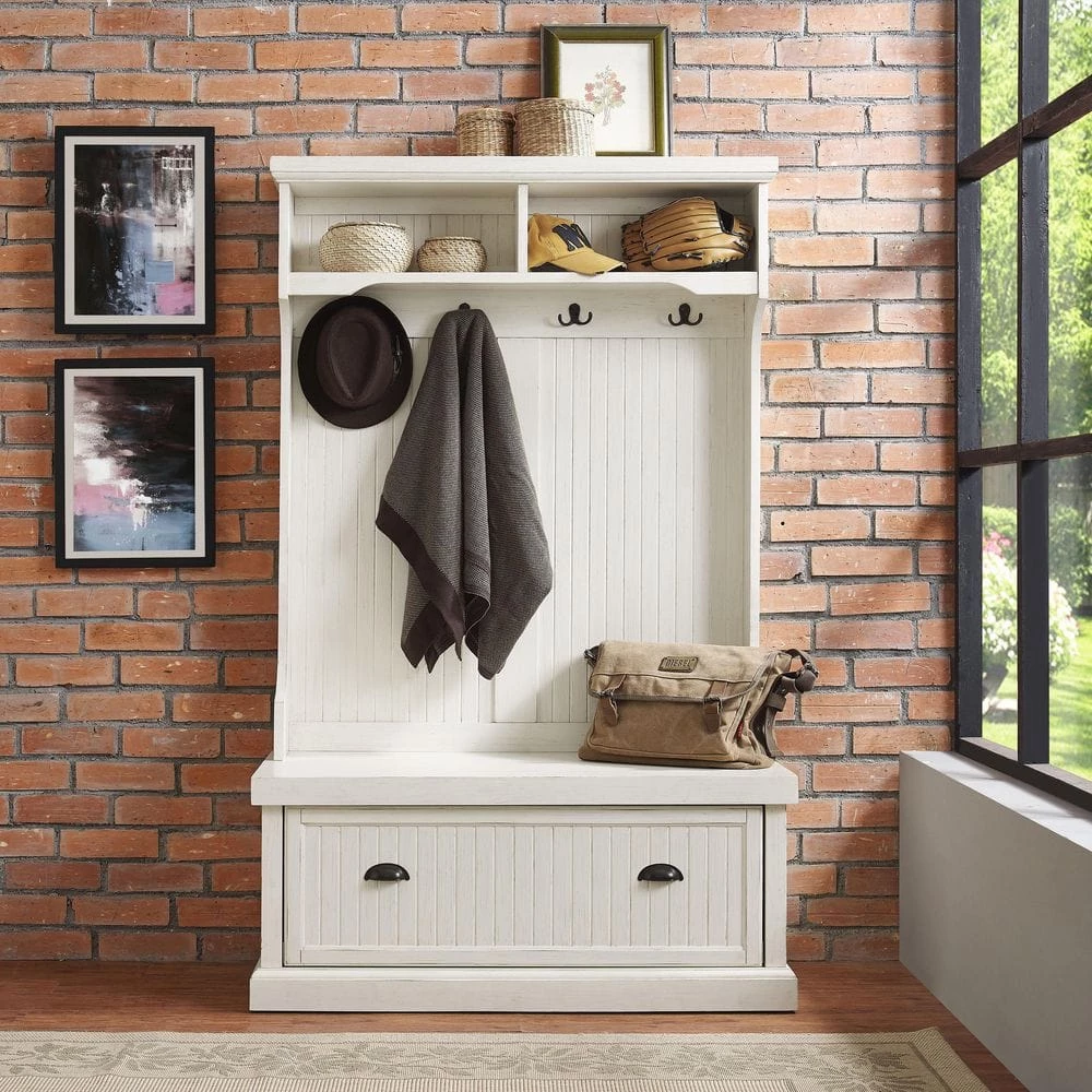 Capture the feeling of an effortless beach home with the Seaside Hall Tree from Crosley. Have a seat on the full-sized bench seat, perfect for getting ready for the day. Constructed from solid hardwood and veneers, the weathered surface softens the classical lines and suits any home. Pull the drop-down drawers forward with genuine metal hardware and find 2-spacious cubbies inside, perfect for storing shoes, scarves, and other clutter best kept out of sight. The tall, slatted back is equipped with hooks for hanging coats out of the way, and 2-more overhead cubbies offer space for decor or storage.