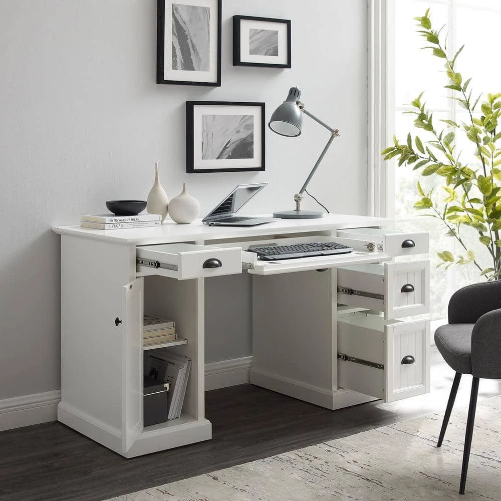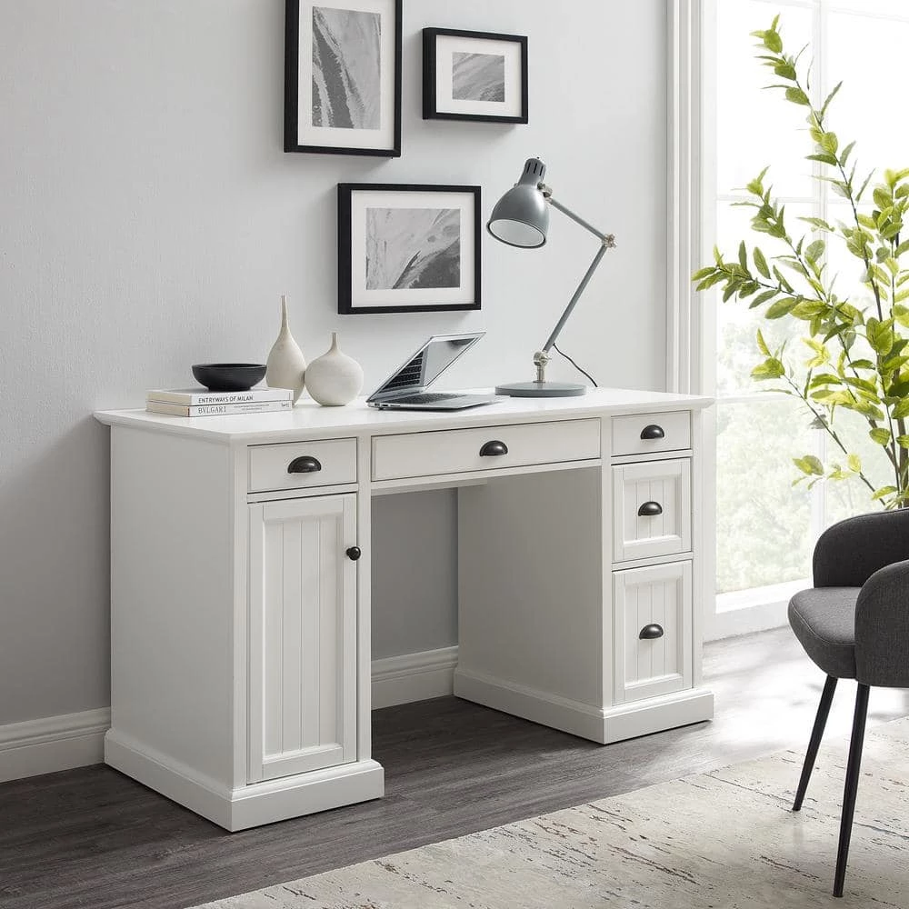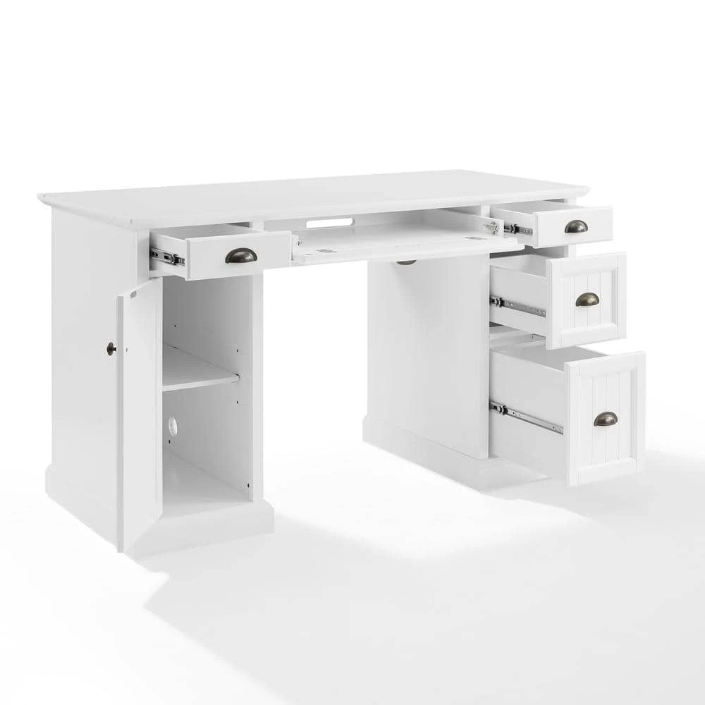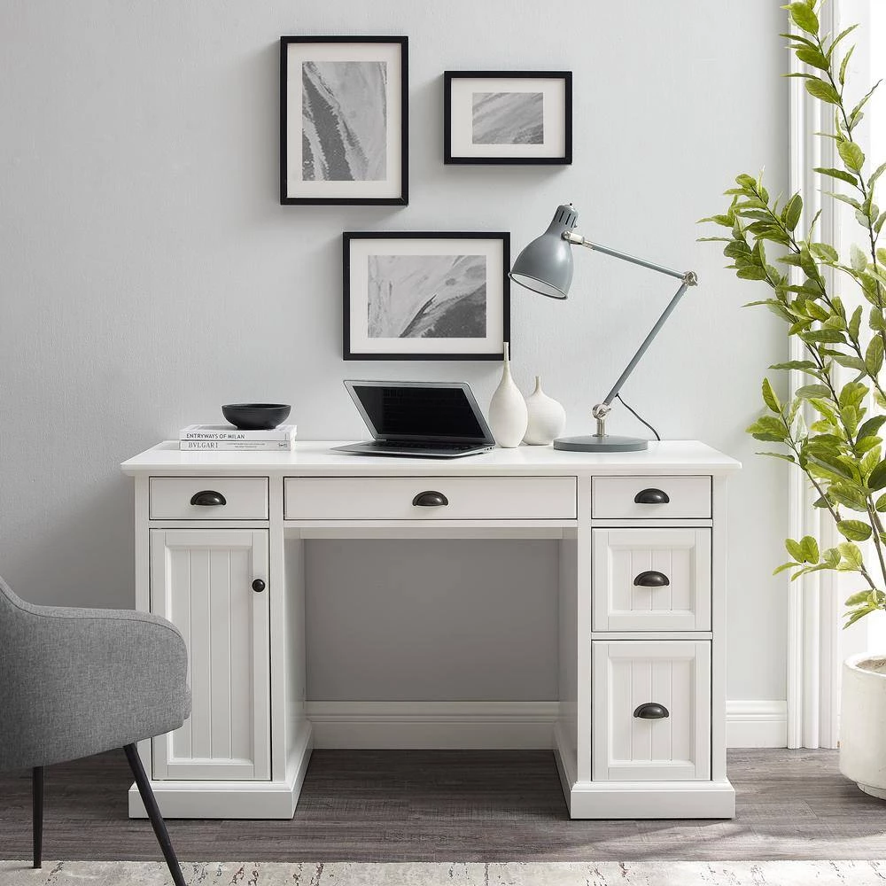 Classic coastal style and ample storage are hallmarks of the Shoreline Computer Desk. Featuring a drop-down keyboard tray and a cabinet for your computer tower, this desk is a telecommuter’s dream. Three storage drawers have full-extension glides, while the large file cabinet drawer keeps documents tidy and close at hand. With decorative elements like half-cup hardware and beadboard paneling, the Shoreline Computer Desk brings style wherever it goes.