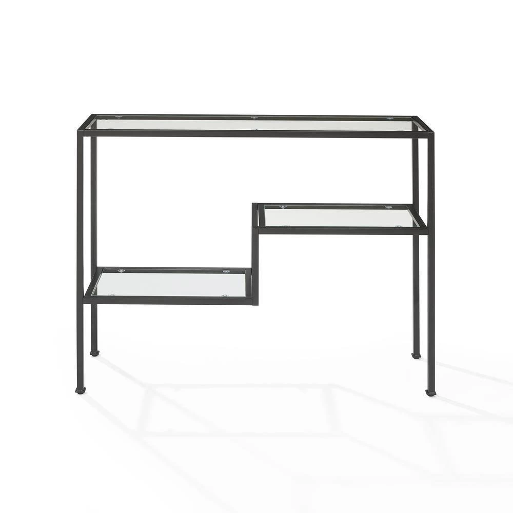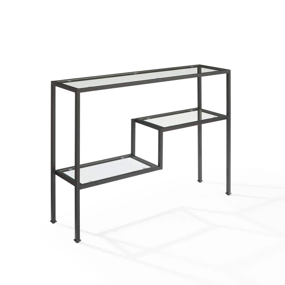 Modern simplicity is the hallmark of the Sloane Console Table. Ready to display your favorite books or decor, this console table’s sculptural steel frame features sturdy tempered glass shelves. Variable shelf heights create a geometric design with Art Deco flair, making this console table a beautiful addition to your living room or entryway.