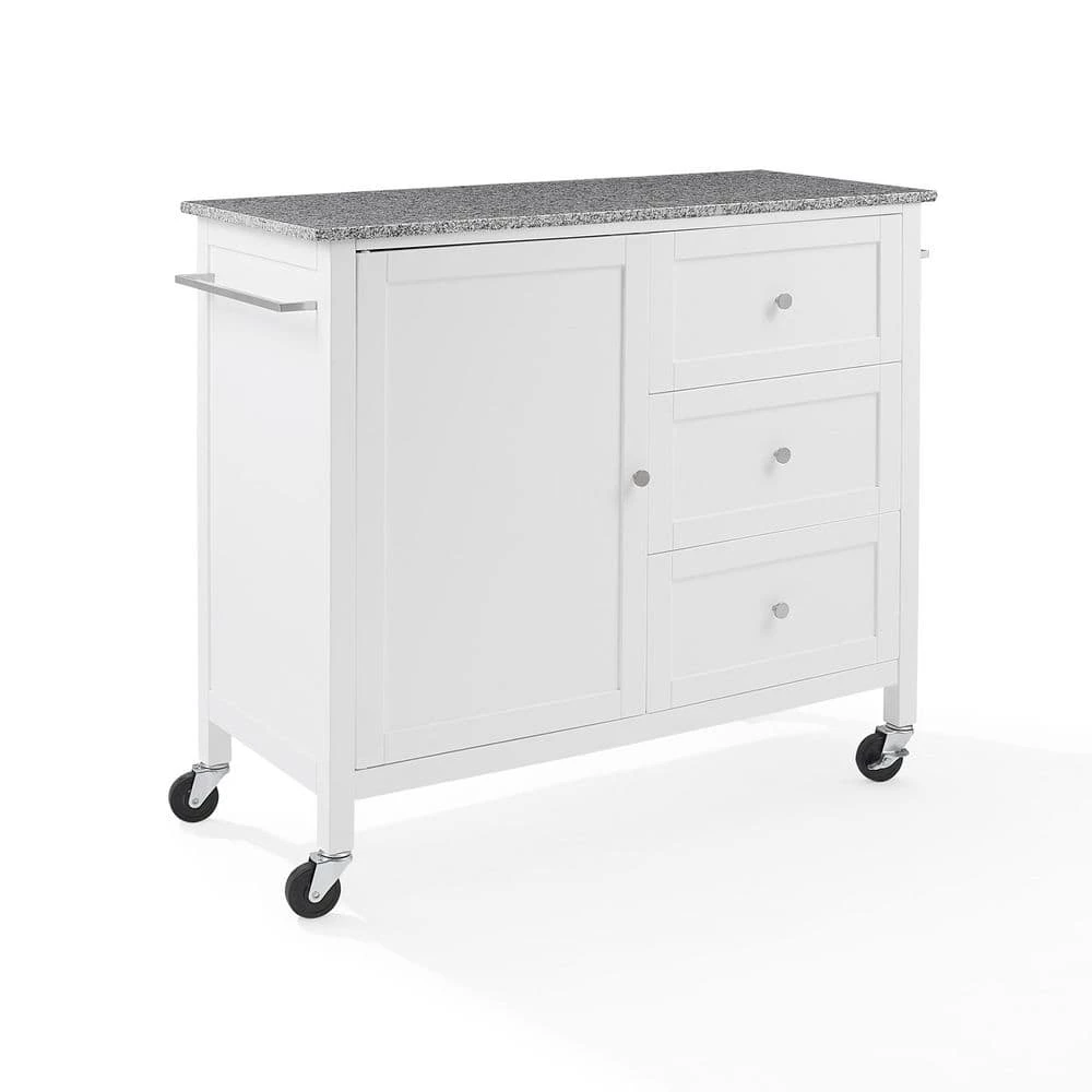 Expand your kitchen storage in style with the Soren Kitchen Island/Cart. Featuring a large cabinet with an adjustable shelf, plus 3 full extension drawers, this kitchen island holds everything from cookware and utensils to small appliances and linens. Showcasing shaker style cabinetry and a beautiful granite countertop, your kitchen workspace will be the envy of the neighbors. With optional caster wheels, this kitchen essential can be used as a stationary island or mobile kitchen cart.