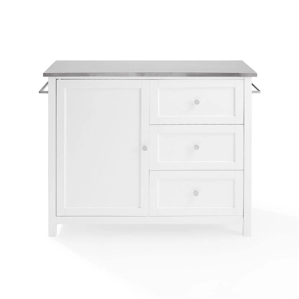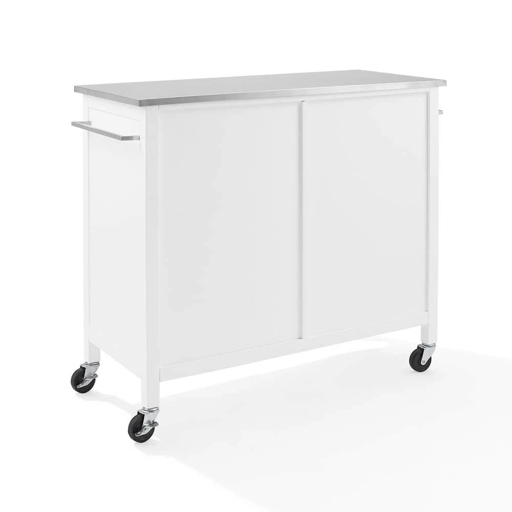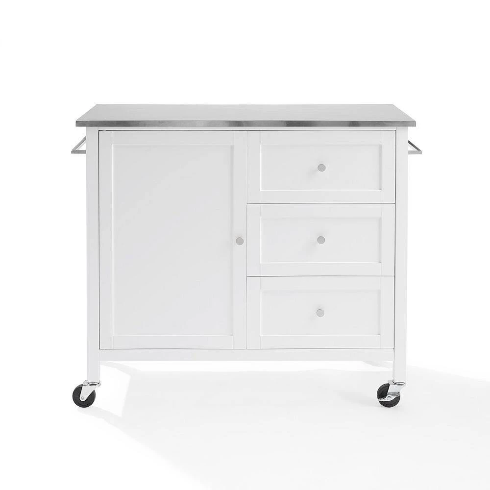Expand your kitchen storage in style with the Soren Kitchen Island/Cart. Featuring a large cabinet with an adjustable shelf, plus 3-full-extension drawers, this kitchen island holds everything from cookware and utensils to small appliances and linens. Showcasing shaker-style cabinetry and a beautiful stainless steel countertop, your kitchen workspace will be the envy of the neighbors. With optional caster wheels, this kitchen essential can be used as a stationary island or mobile kitchen cart.