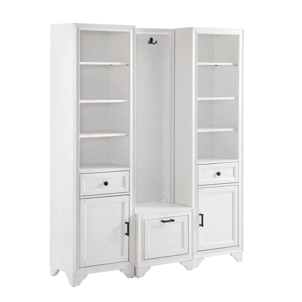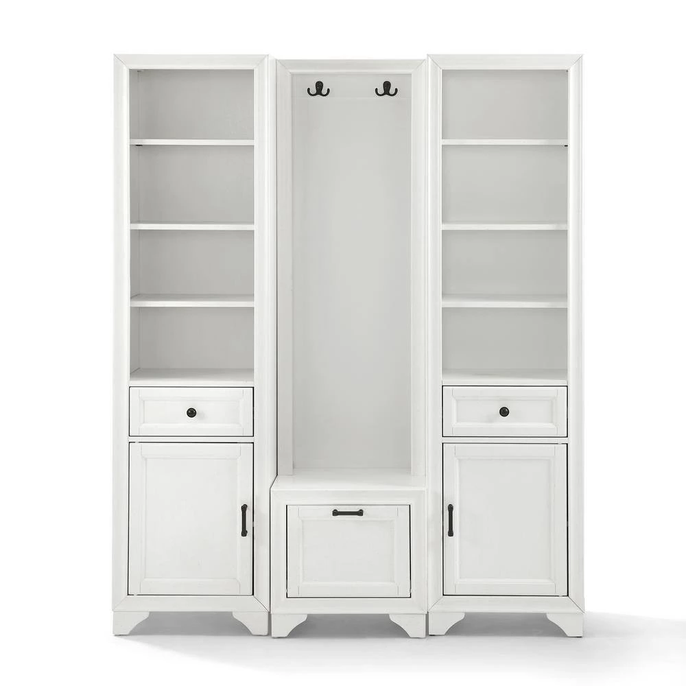 Add charm and stylish storage to your entryway with the Tara 3pc Entryway Set. Featuring two tall cabinets and a hall tree, this set checks all the boxes for home organization. Each tall cabinet has three adjustable open shelves, a full-extension drawer and a lower cabinet with an adjustable shelf. The hall tree has two double prong hooks plus a lower compartment with a hinged door and magnetic closure. This set offers storage for daily use items like shoes and book bags, plus long-term storage for seasonal items like gloves and scarves. Add some small storage baskets and your favorite decor and the Tara 3pc Entryway Set will be your favorite new home organization tool.