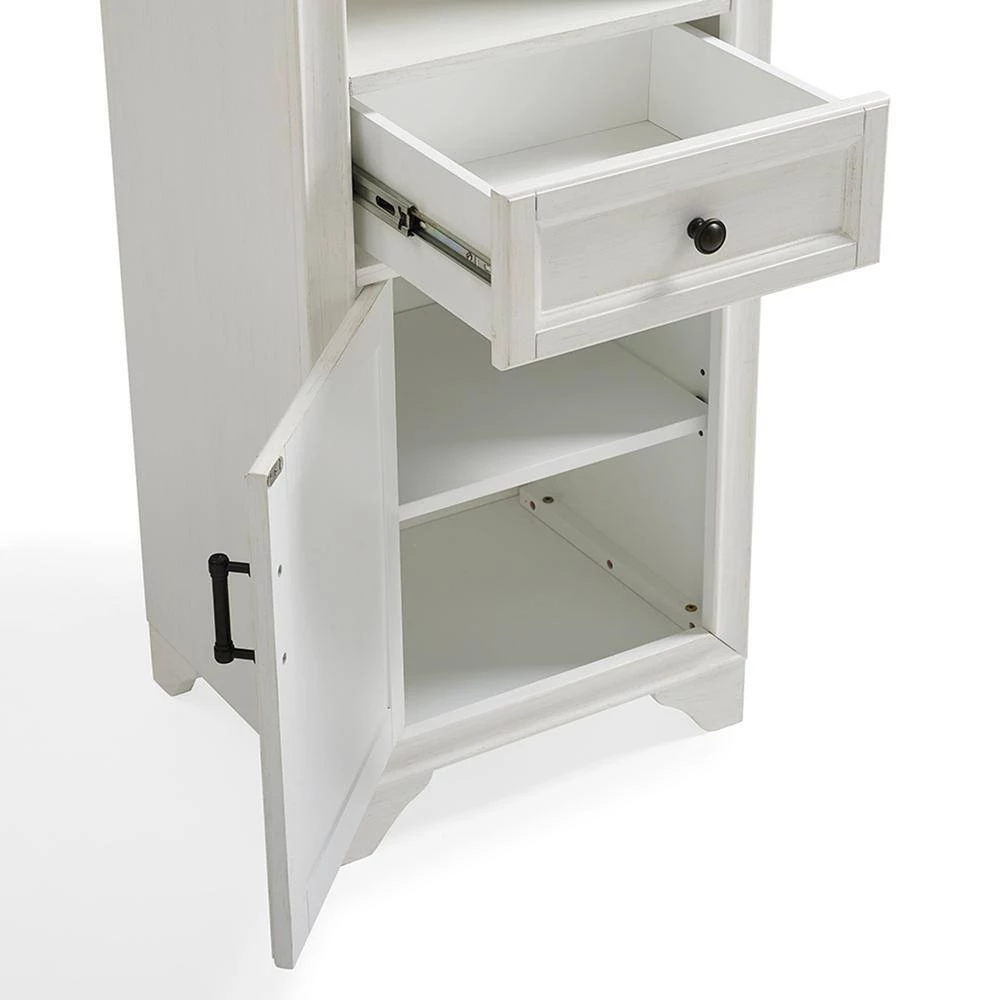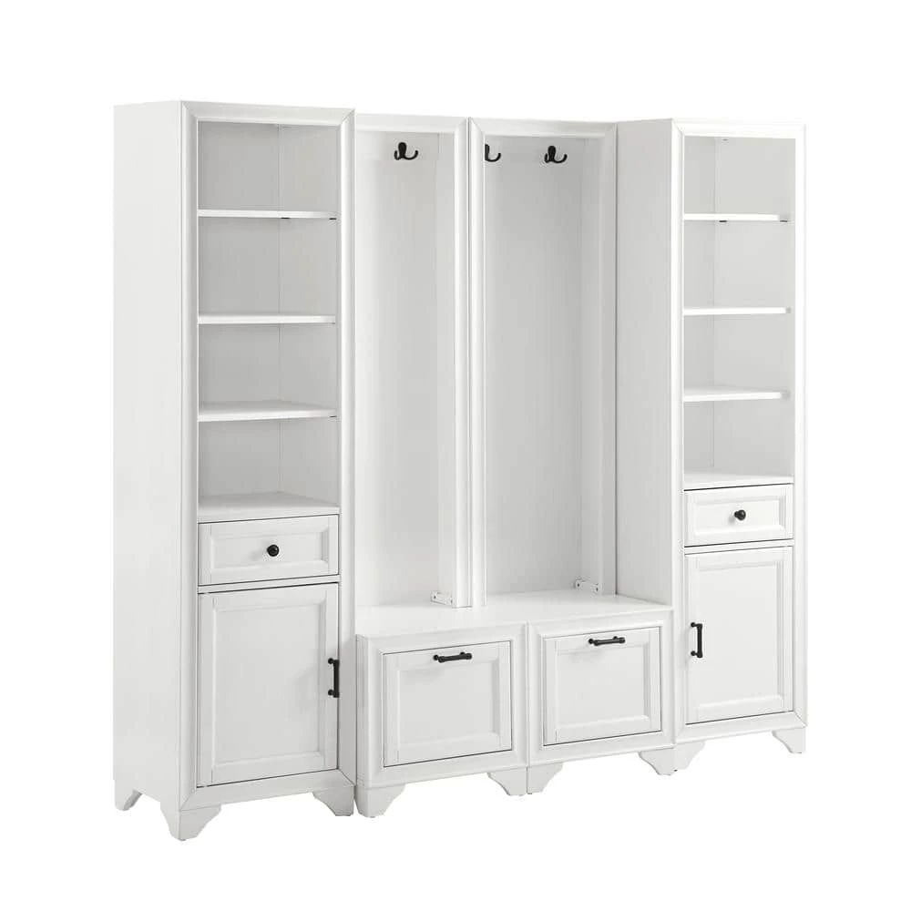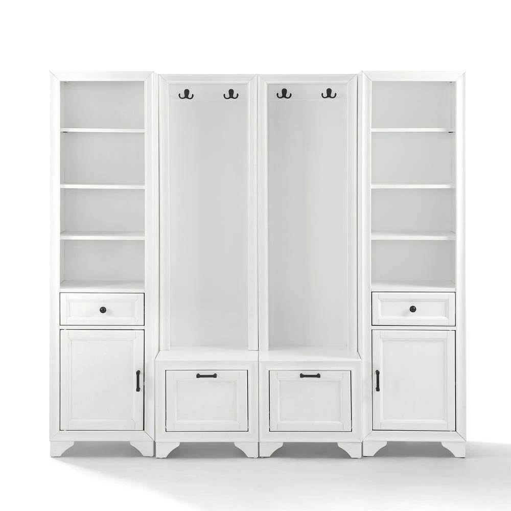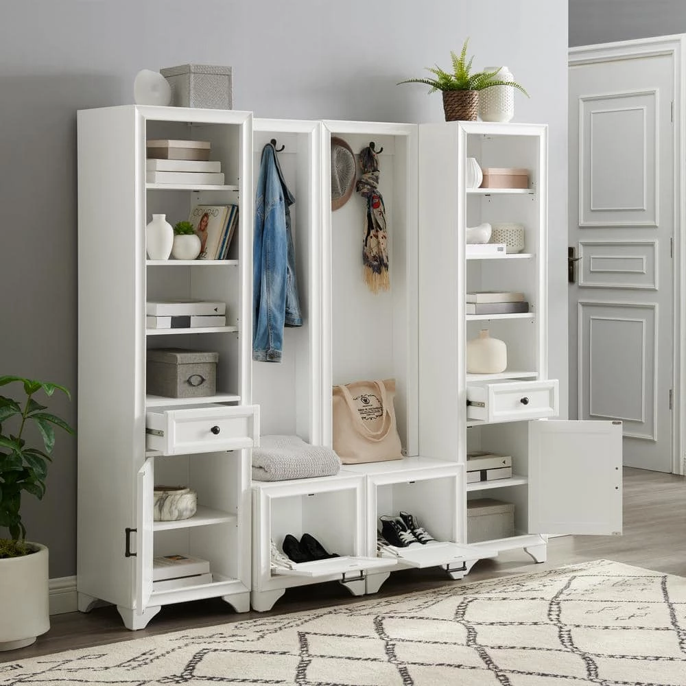 Add charm and stylish storage to your entryway with the Tara 4pc Entryway Set. Featuring two tall cabinets and two hall trees, this set checks all the boxes for home organization. Each tall cabinet has three adjustable open shelves, a full-extension drawer and a lower cabinet with an adjustable shelf. The hall trees each have two double prong hooks plus a lower compartment with a hinged door and magnetic closure. This set offers storage for daily use items like shoes and book bags, plus long-term storage for seasonal items like gloves and scarves. Add some small storage baskets and your favorite decor and the Tara 4pc Entryway Set will be your favorite new home organization tool.