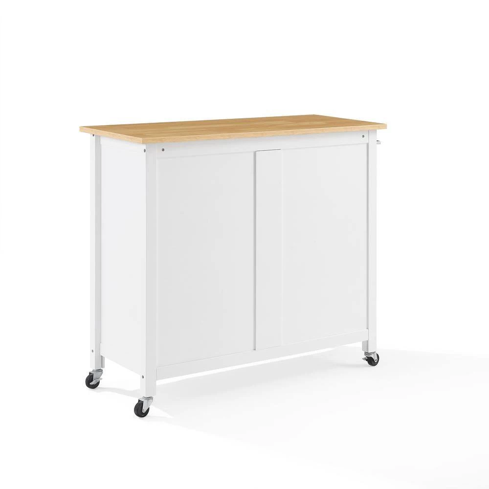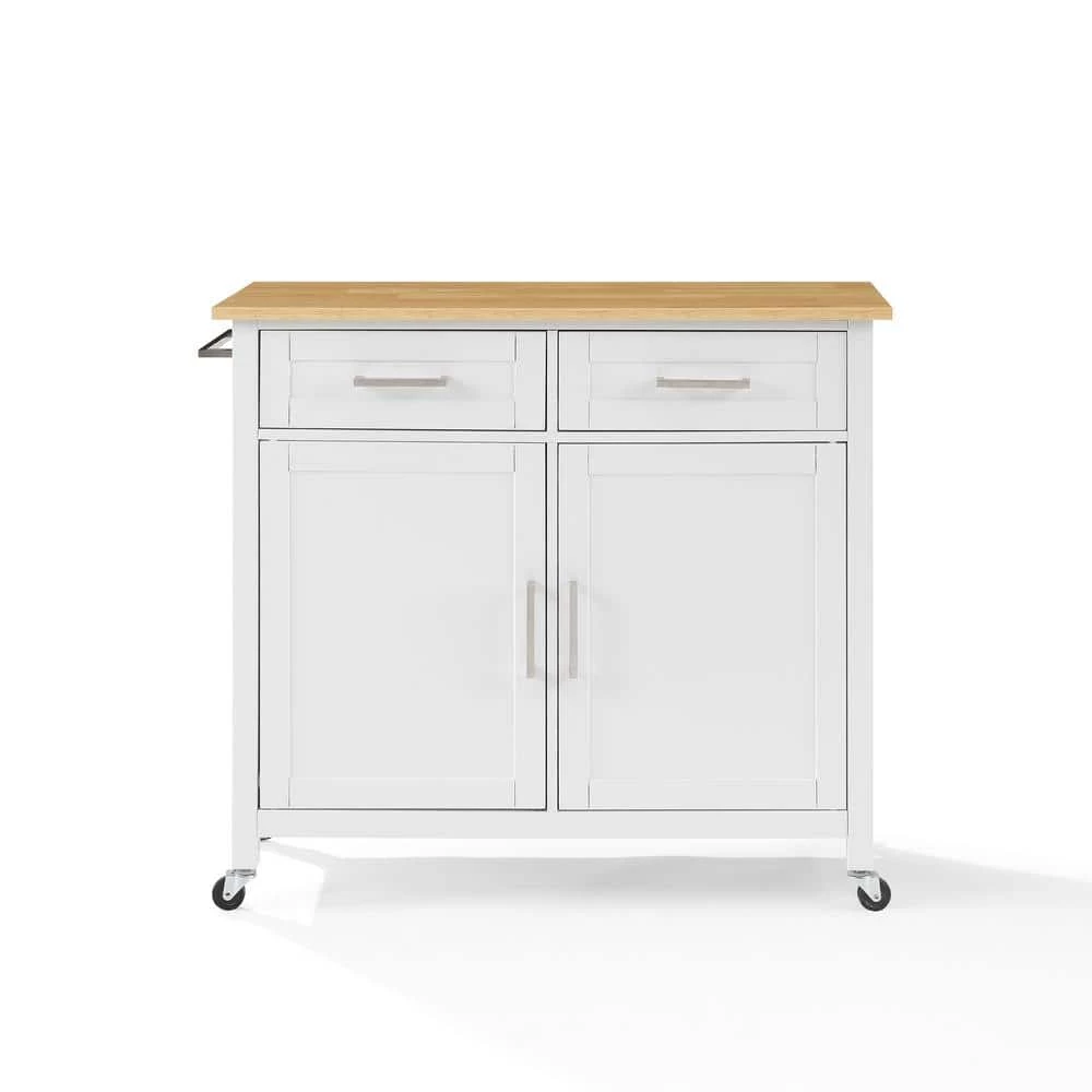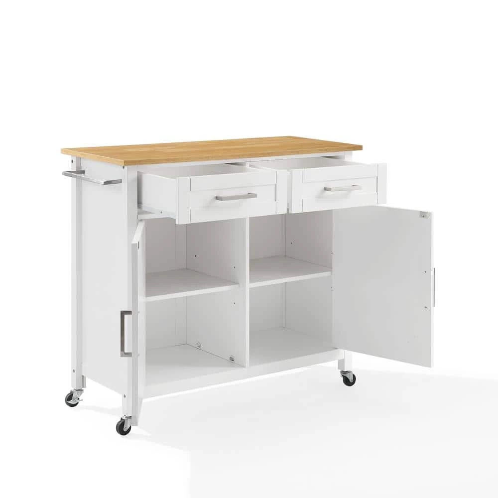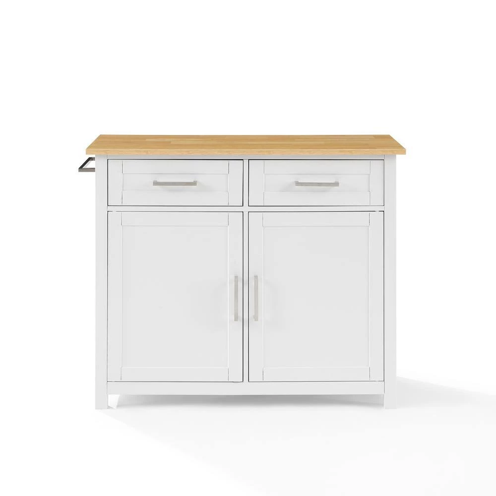 The Tristan Kitchen Island/Cart offers classic style and ample storage. Two large cabinets with adjustable shelving provide flexibility for storing kitchen essentials like pots and pans, while the storage drawers are ideal for corraling utensils and flatware. A large countertop and towel bar create a convenient workspace. Optional caster wheels allow the Tristan Kitchen Island/Cart to go mobile and adapt to any kitchen space.